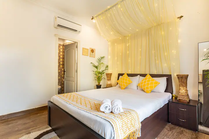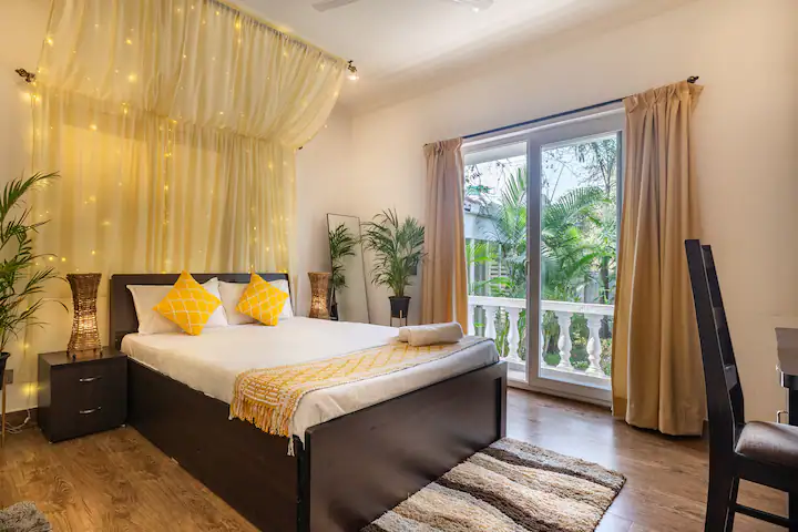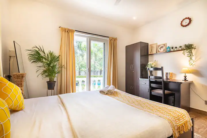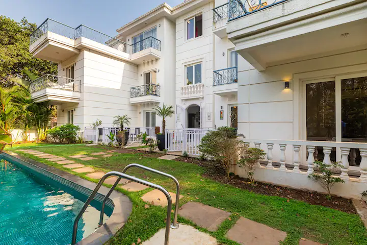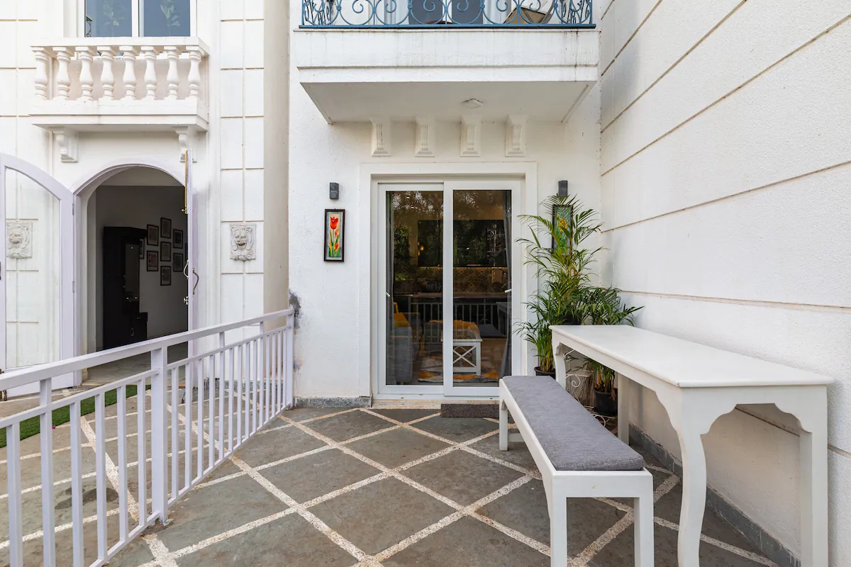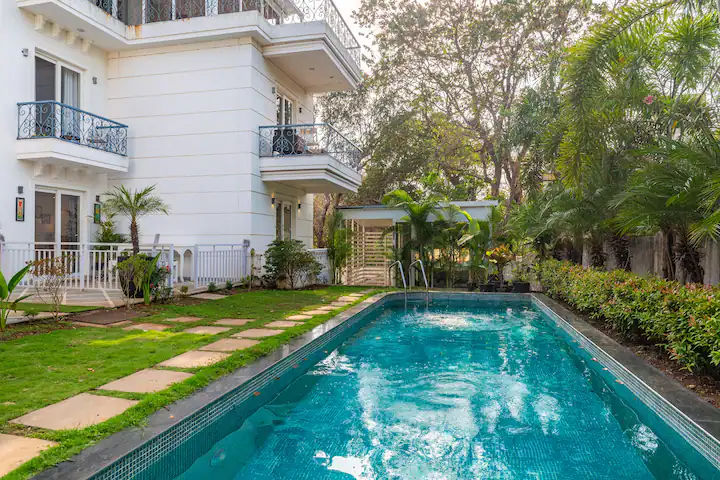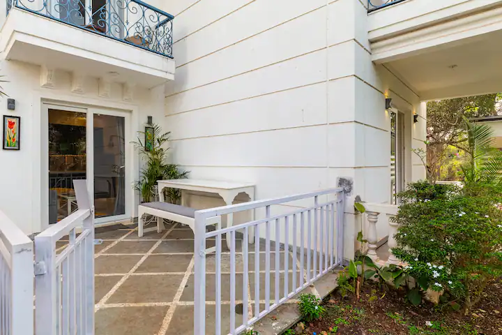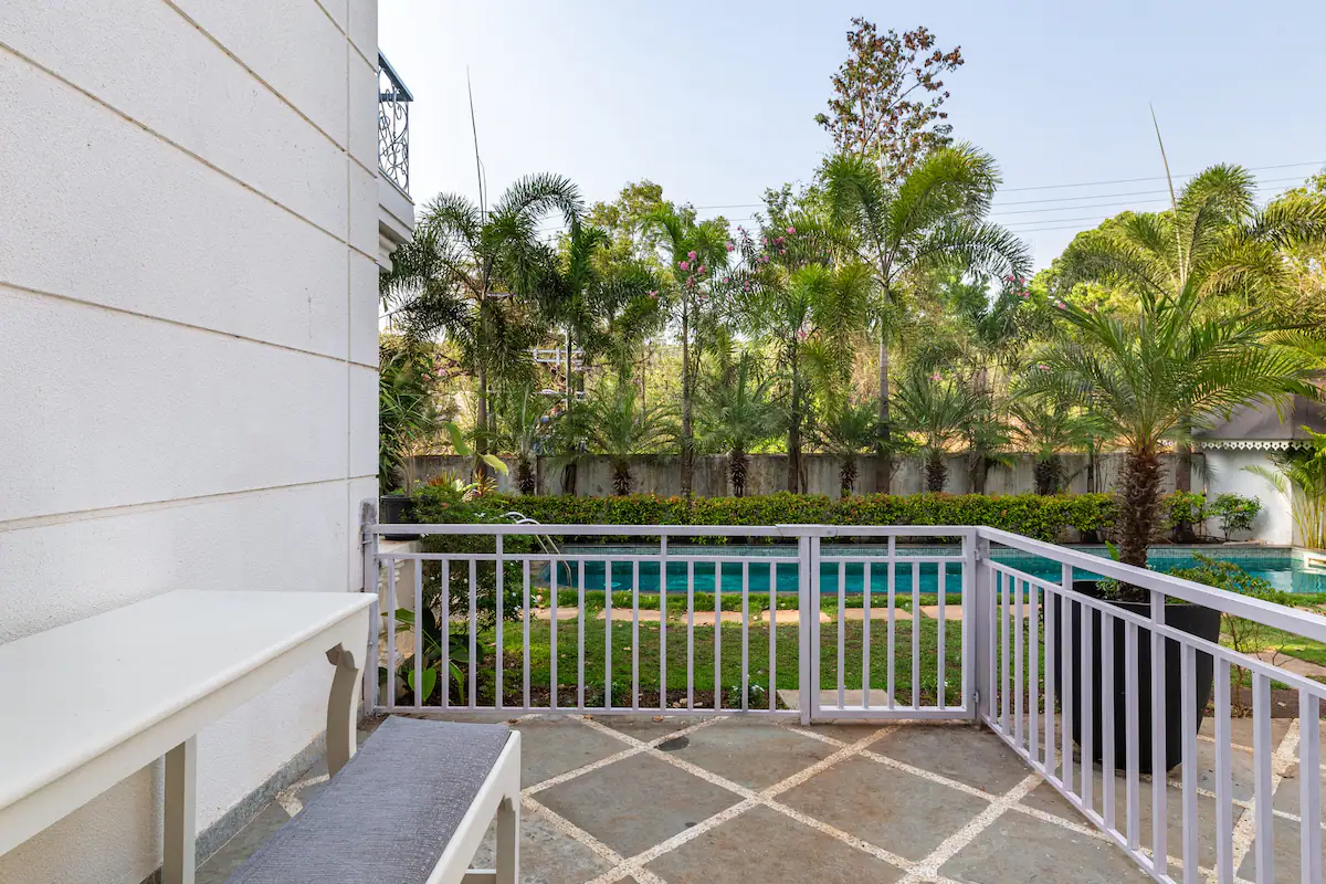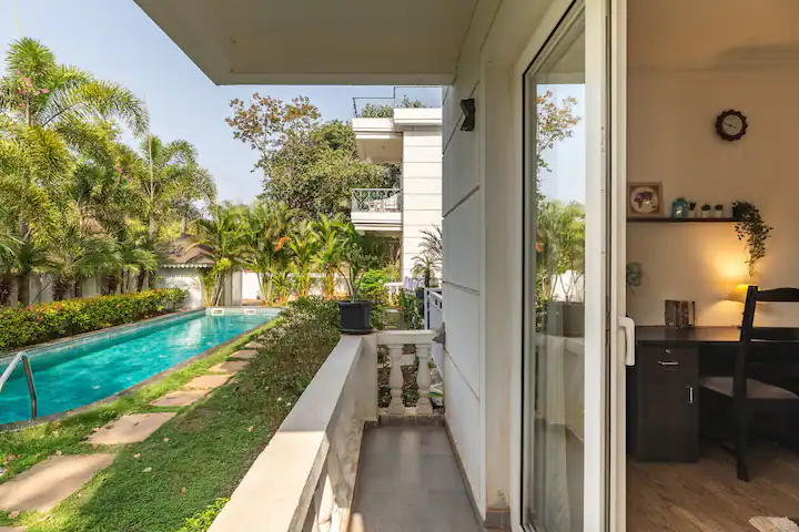 The Pool House is unique as it has direct access to the pool from the open patio adjoining the hall .Being on the ground floor ,our guests can enjoy a relaxing swim right outside the apartment . The property is surrounded by lush green cover ,a fully equipped kitchen ,en-suite bathrooms ,ACs in all rooms ,hi speed wifi ,power back up and covered parking. For the security of our guests there is 24/7 security and CCTV cameras strategically placed .